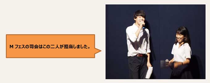 今年は昨年度に引き続きペンライトの使用が許可され、本番は大いに盛り上がりを見せました。Mフェスという全学年共通の音楽イベントを通じて、生徒間の繋がりがより強くなったように思います。先生方や集会委員のサポートもあり、Mフェスは無事成功する事ができました。企画、運営に携わってくれた出演者、司会の皆さん、先生方、集会委員、放送部、業者の方々、全校生徒の皆さん、ありがとうございました。