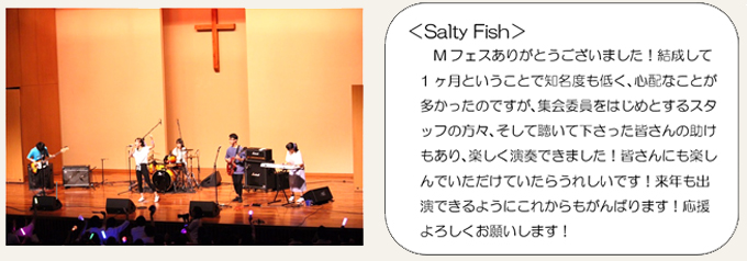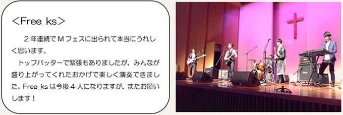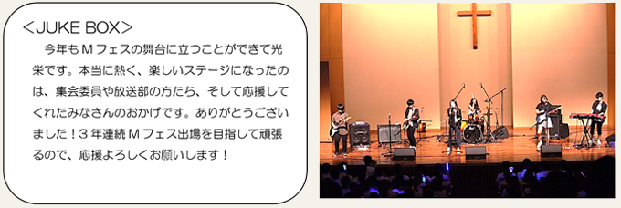 今年も無事、Mフェスを終えることができました。協力してくださったバンドのみなさん、業者さん、放送部員、集会委員のみんな、そして司会者の二人、並びに顧問の先生方に心から感謝申しあげます。最高の舞台を作ることができたのは、本当に皆さんのおかげです。集会委員として課題や改善点も見つかり、来年に向けてまた新たな準備を進めていきます。今年のステージを見て、出たい!と思ったそこのあなた、次はあなたの番です!今後もMフェスをよろしくお願いします。みなさん、本当にありがとうございました。