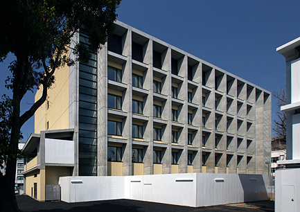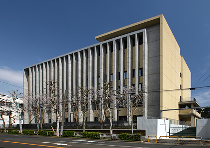 西側(八幡通り)からみた西校舎です。西日が教室に差し込まない様に柱と縦のリブが交互に並んでいます。縦のラインを強調した外観となっています。