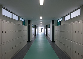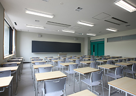 PS講堂1階部分は、図書館/閲覧室、学習室。充実した蔵書、貸し出しCD、DVD等が生徒の知識欲を掻き立てます。2階部分は、PS講堂1階客席部分とPC実習室(2室)。一人1台与えられるPCで、情報教育を基礎から学びます。北校舎と西校舎の2・3階部分は、PS講堂の1階客室部分と接続します。また、同様に4階部分は、2階客席部分と接続です。