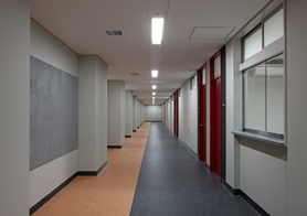 各階で廊下の色が異なります。B1階のフロアーは大樹を支える根をイメージします。