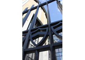 さて、完成した新PS講堂、北校舎をご紹介させていただきます。大学図書館側(北側)には、以前のようにポルティコが存在。高等部生を毎朝迎え入れます。新入生(高等部63期生)が正門をくぐると、スプローズ先生の暖かい眼差しが注がれます。一転、エントランス上部を眺めれば、「旧北校舎中央階段にあったステンドグラス」。高等部の面影は残されたままです。