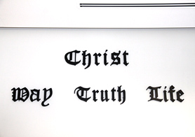 旧校舎から引き継いだもの「道、真理、命」(エントランス壁面)