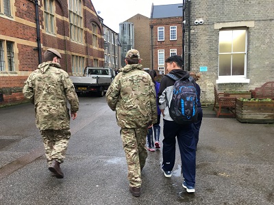 CCF(Combined Cadet Force) といわれる、リーダーシップや責任感、忍耐力などを養うことを目的としたイギリスならではの訓練の授業では、今回特別にShooting(射撃)の授業に参加することができ、先生の丁寧な指導のもと実際にライフル銃を手に取る体験をしました。