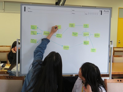 学校に戻った後は、このアテンドツアーを通して発見したこと、考えたことについて意見を出し合いながら付箋にまとめ、プレゼンテーション形式で発表し合いました。新しい発見と多くの気付きが与えられ、渋谷の街づくりにおけるユニバーサルデザインという概念を参加生徒全員で共有することができました。