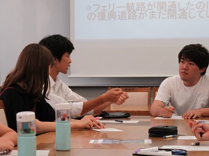 みやこ訪問プログラムに参加した卒業生らを迎え、放課後の時間を使って今後の被災地支援活動についての座談会を実施しました。被災地の現状と問題点を理解した上で、具体的な打開策や地方創生案を考え、各々が意見を述べ合いました。