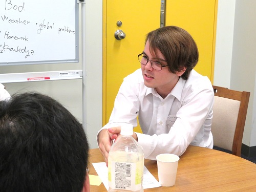 「今のあなたの幸せ指数は1から10段までのうち、今のあなたは何段目?」と、グループ内で意見交換するところからセッションが始まりました。世界世論調査で使われている、主観的な幸福感の測定尺度「キャントリルの梯子」(the Ladder of Happiness)の概要を学び、自分の幸せ指数の理由も述べながら、各グループの平均値を算出。その後はそれぞれのグループが英語で意見を発表し合いました。