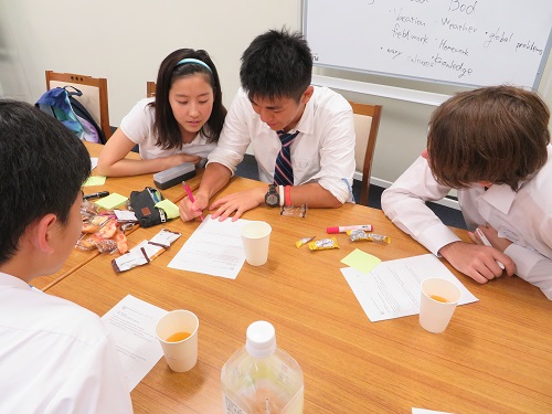 世界中の国民が「最も幸せに思うだろう状況・条件」と「最も不幸だと思うだろう状況・条件」を書き出し、国民レベルのハピネスを規定する4つの要因を話し合いました。そして、各グループで作った4つの要因モデルを用い、日本の測定を考察。日本は世界ランクの中で何番目に位置するのか、日本の前後にはどんな国が並ぶのか、世界で一番幸せな国はどこなのか等、ディスカッションが盛り上がりました。