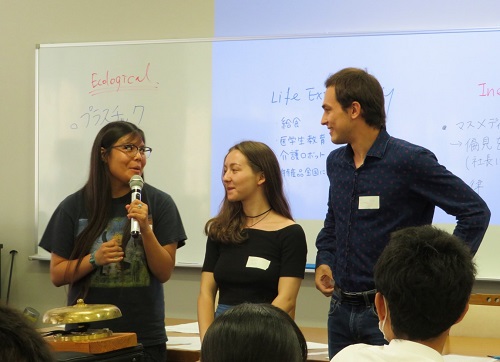 セッション終盤には、各グループに4つのファクター 「Ecological Footprint」 「Life Expectancy」 「Inequality」 「Overall Satisfaction with Life」が割り当てられました。それらに基づいて、日本のどのような点が良いのか/悪いのか、そして、5年後の日本を想像しながら各々のファクターを引き延ばす為にはどのような改善が必要なのかを話し合い、プレゼンテーションを通して共有し合いました。