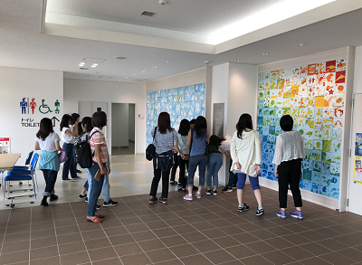 ・最初に宮古湾フェリーターミナルに向かいました。宮古―室蘭航路の就航を記念して、青山学院内でも行った「壁画プロジェクト」完成の様子を見学しました。
