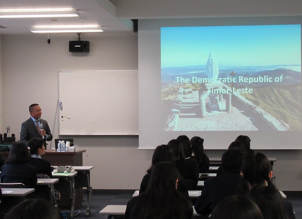 高大連携プログラム大使館講演会の第2弾では、高等部生徒自主学習団体ブルーペコのフェアトレード活動でも関わりの深い国、東ティモール民主共和国大使館からゲストをお迎えしました。