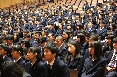 全学年対象オリエンテーションでは探究学習に焦点を当て、在学中に全校生徒が取り組む平和共生論文についての理解を深めました。また、現在JICA国際協力人材部に勤務されている本校卒業生の土本周さんをお招きし、探求活動の土台となる「問い(仮説)をもち、突き詰めていくことの大切さ」についてお話していただきました。