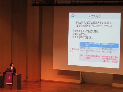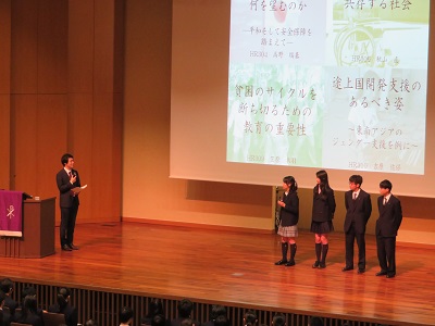 さらに続けて、現在本校で自主的に活動している生徒団体のビデオプレゼンテーションを公開し、課題を認識して解決策を探り、仲間とともに学び合うことの喜びと大切さを伝えました。