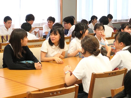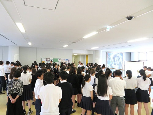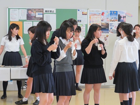今年の夏休みに岩手県宮古市へ訪問した生徒が中心となって、昼休みの時間をつかって報告会を実施。宮古市で「学ぶ防災」ツアーや震災遺構「たろう観光ホテル」を訪れ、地域の方々の交流の中で学んだことを生徒と共有する時間を持ちました。当日は宮古産の磯とろろのスープも振舞われ、100名を超える生徒がブースに立ち寄って生徒の報告に耳を傾けていました。
