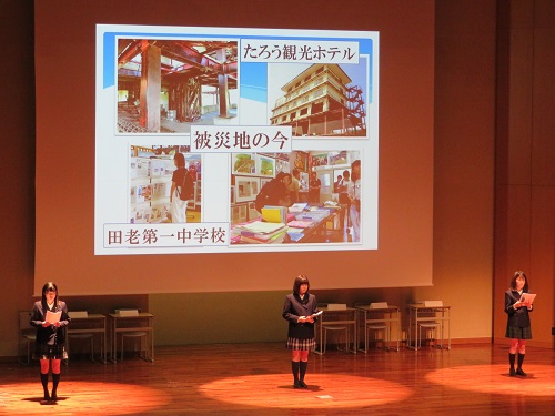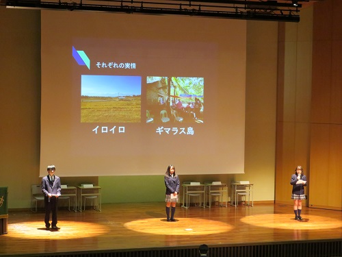 第一部では高等部長の挨拶にはじまり、生徒による宮古・東ティモール・フィリピンへの訪問プログラムの報告発表を行いました。