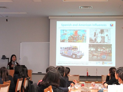 講演会は全て英語で行われ、フィリピンの文化や食事、日本とフィリピンとの関係など写真を交えながらお話いただきました。