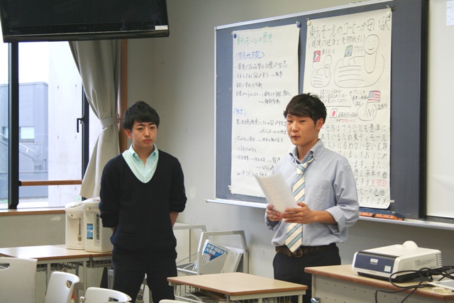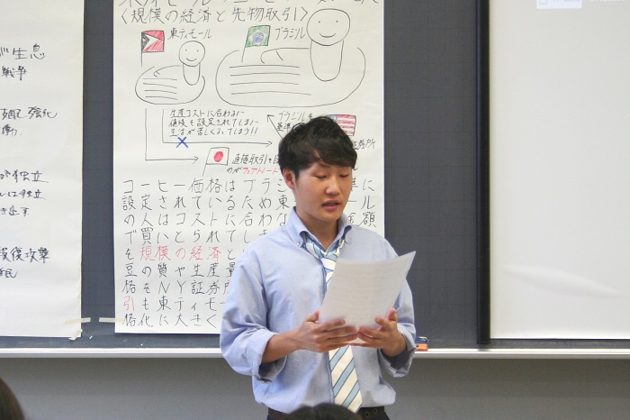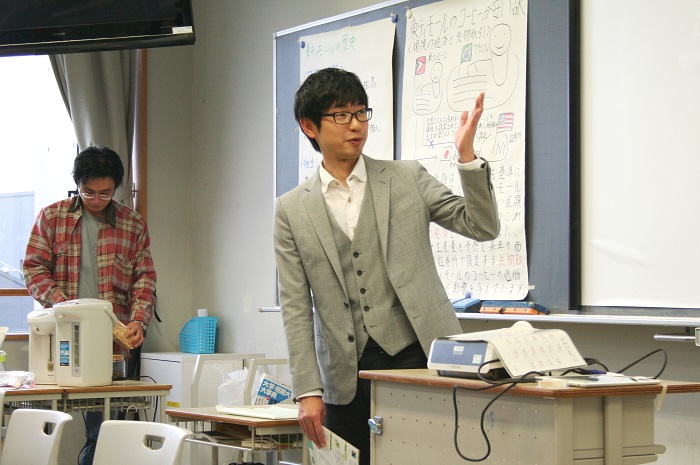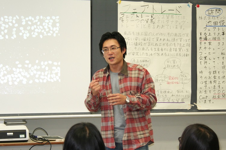 最初にブルーペコの代表二人によるフェアトレードについてのポスター発表を行い、現在ブルーペコが携わっている東ティモールの歴史やフェアトレードの状況について話しました。