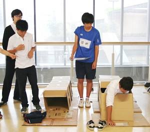 生徒たちは実際に段ボールハウスの中に入ってみたり、缶が入った袋を実際に持ち上げてみたりして理解を深めました。