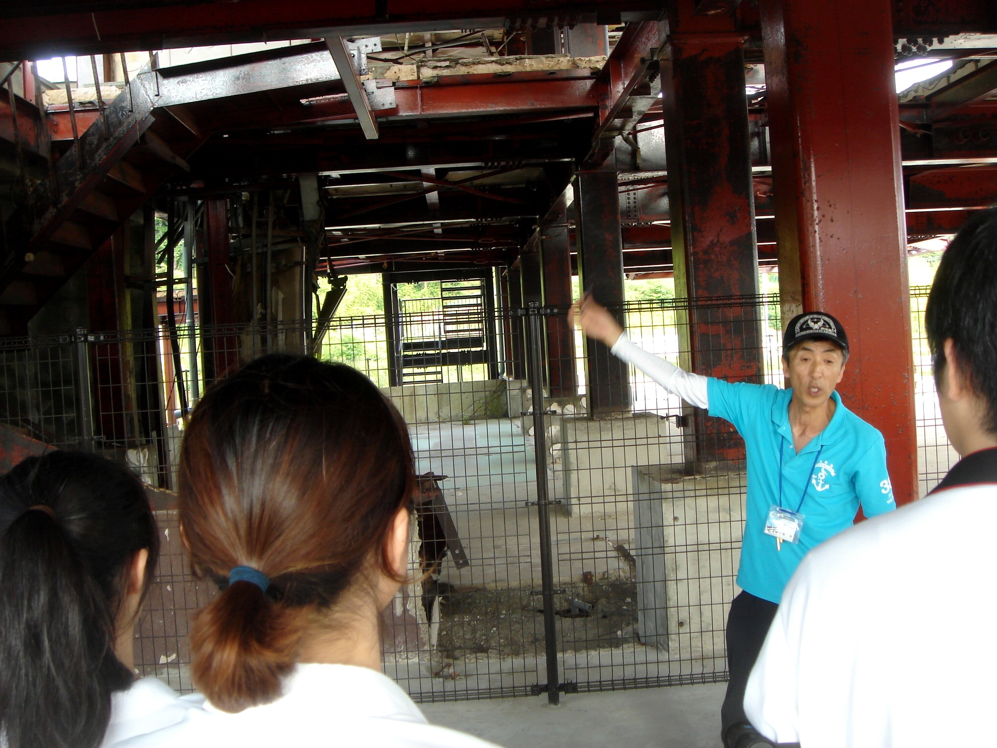 初日は、田老地区にて防災研修、建物下部が津波で鉄筋だけとなった「たろう観光ホテル」、また津波被害を受けたキャンプ場の被害状況を残しつつ、がれきを用いた再生資材で作られた高台で東日本大震災の津波と同じ目線を体験できる「中の浜メモリアルパーク」の2つの震災遺構を見学しました。
