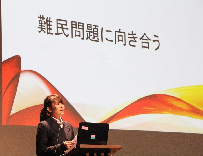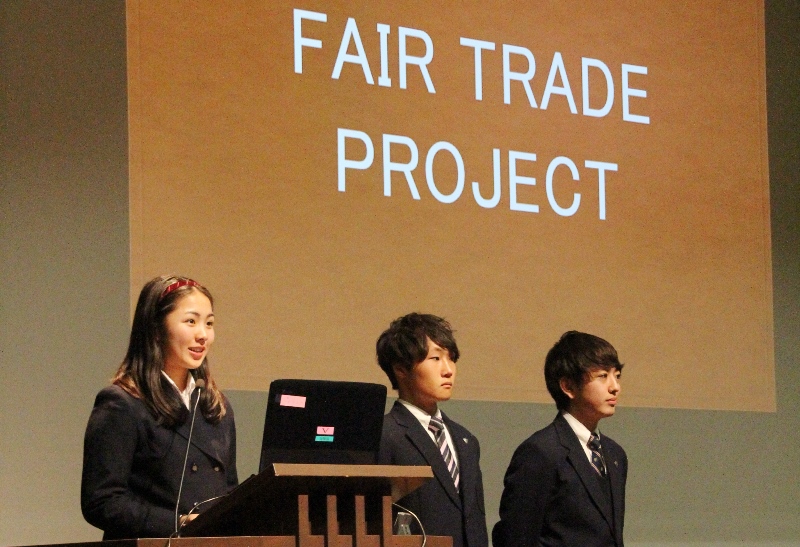 第一部では本校の取組に関する教員からの概要説明と報告、3名の生徒による「平和共生論文」発表 、生徒によるフェアトレードプロジェクトに関する報告を行いました。