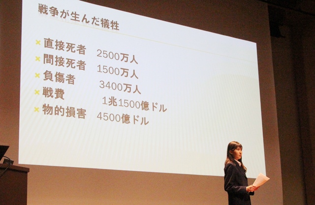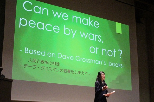 平和共生論文の発表ではそれぞれ「難民問題と向き合う」「反戦歌と平和」「人間と戦争の相性-デーヴ・グロスマンの著書をふまえて-」をテーマにプレゼンテーションを行いました。