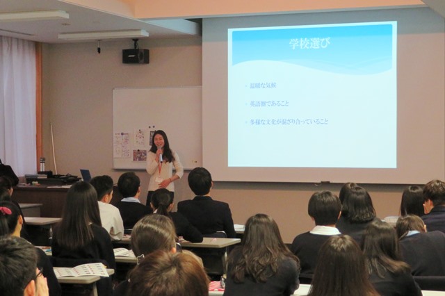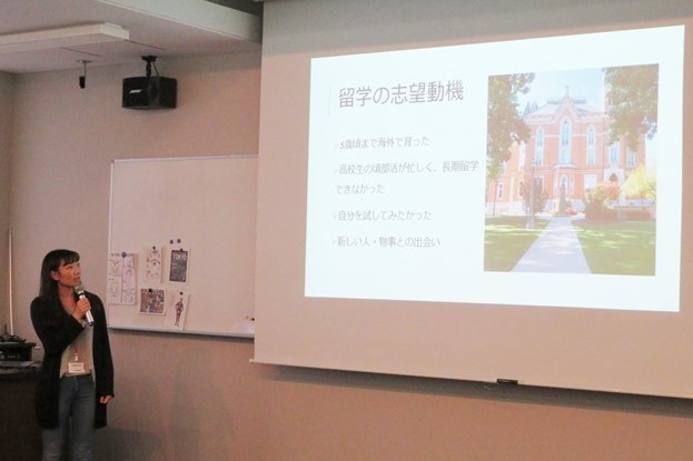それぞれアメリカのインディアナ州、ハワイ州に留学していた学生2名からは志望動機から留学準備の流れ、そして留学で得た事などについてお話を聞くことができました。