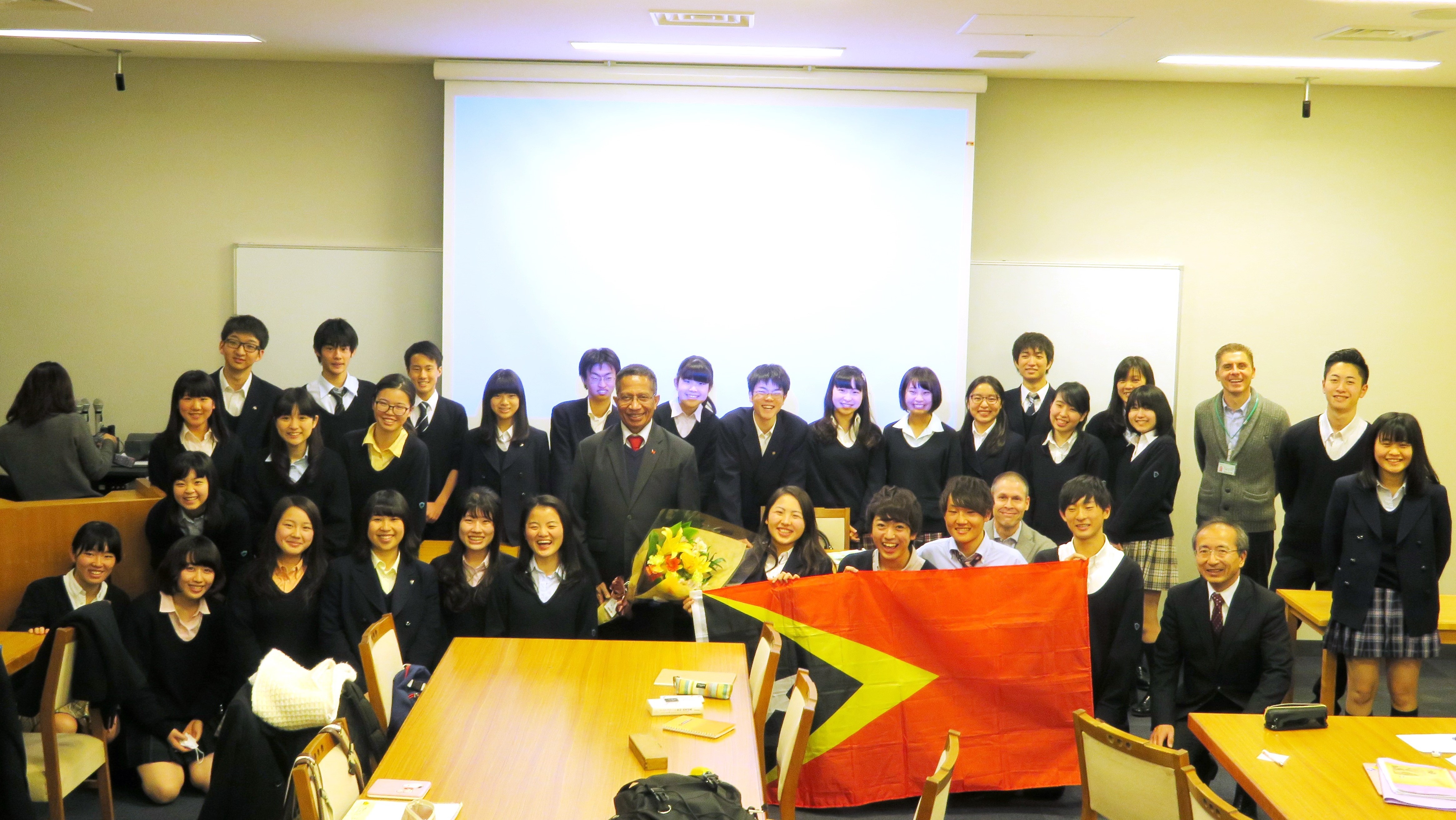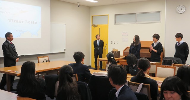 大使は「今後の東ティモールと日本の関係は?」「日本人と東ティモール人の共通点と違いは?」 など、生徒からの沢山の質問に対して、ひとつひとつ丁寧に答えてくださり、さらに東ティモールについて理解を深めることが出来ました。