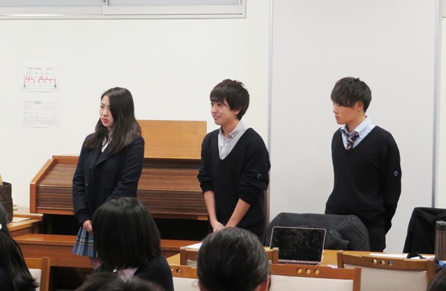今回は最初に実際に現地で研修を行った生徒を含め、ブルーペコの代表者3名が歓迎のあいさつと高等部での活動について話し、大使をお迎えしました。