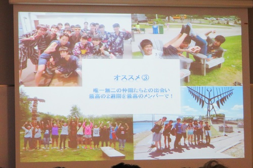 説明会はプログラムの概要から始まり、昨年度のカナダホームステイの様子を撮影した映像、昨年度の参加者の発表、