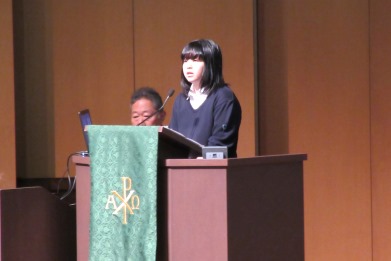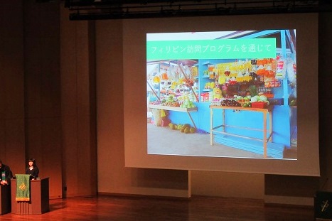フィリピンに訪問した生徒のうち1名が礼拝で話をし、フィリピン訪問プログラムを通して感じた事や、現在高等部がクリスマス献金を通して支援しているチャイルドが通っている学校・生活について共有する時間を持ちました。