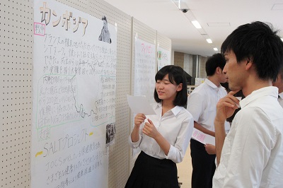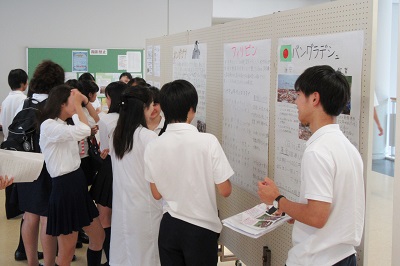 現在、ボランティア部は古切手や書き損じはがきの回収、また文化祭での手芸品販売を通してアジアの国々(バングラデシュ、フィリピン、ネパール、カンボジア)の支援活動をおこなっています。そこで、支援をしている各国の状況の展示を行い、プレゼンテーションとクイズを実施しました。