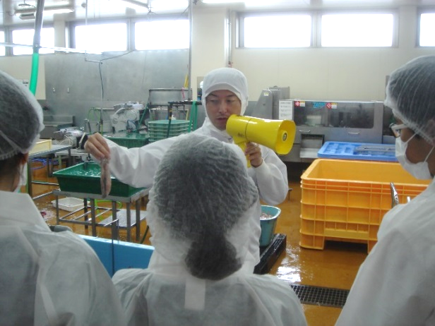 地元で活動するNPO法人「みやっこベース」に地元の水産業を学ぶツアーを企画してもらいました。地元で水産加工業を営む「イカ王子」こと鈴木良太さんのコーディネートのもと、魚市場で震災後の水産物の推移について聞き、水産加工工場で作業工程を見学しました。イカ王子から水産業と宮古にかける熱い思いとチャレンジを続ける姿勢を伝えられました。