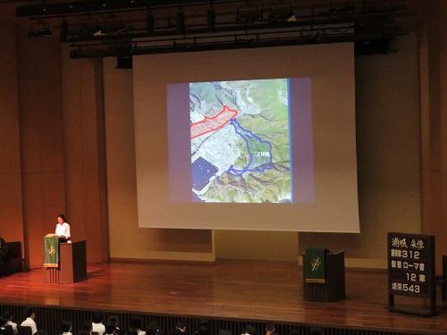 宮古に実際訪問してみた感じたこと、これからの支援について自分が考えたことを生徒が話しました。今後の支援の具体的なあり方として、今年度6月に実施したグローバルウィークⅠで行われたフィリピンレタープロジェクトからアイディアを得、被災地の方々との文通を通してつながり、新たな支援のかたちとすることが出来たら良いのではないか、と話しました。