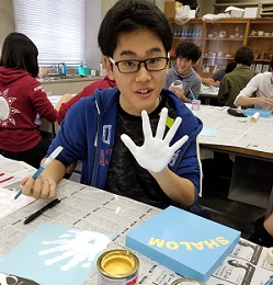 内容は参加者の手形に日本各地や世界の挨拶の言葉を添えた壁画を作成というもの。生徒からの発案で、ヘブライ語で「平和」を意味し挨拶のひとつでもある「SHALOM」を加えることになりました。このアイディアから、プロジェクトのテーマにより沿った作品を作り上げることが出来ました。