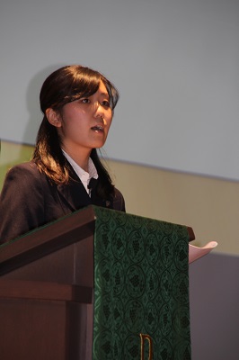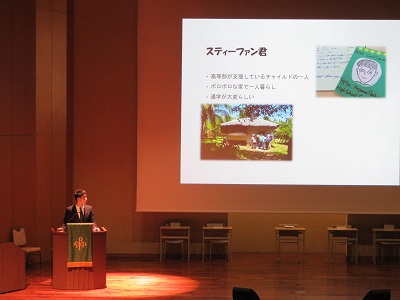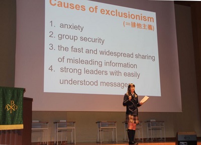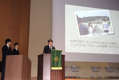 第一部では高等部長のご挨拶にはじまり、生徒による宮古・東ティモール・フィリピンへの訪問プログラムの報告発表、また3年生選択クラス「オーラルコミュニケーション」から生徒による英語でのプレゼンテーションを行いました。