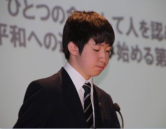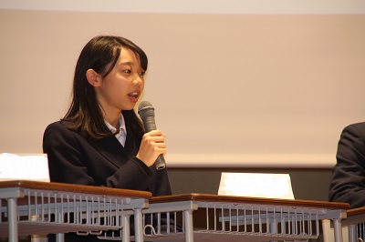 第二部では5名の生徒による「平和共生論文」発表 と英語を使用したパネルトークセッションを行いました。平和共生論文の発表では、それぞれが仕上げた本来の論文をギュッと凝縮・要約してプレゼンテーションしました。(以下、論文タイトル)