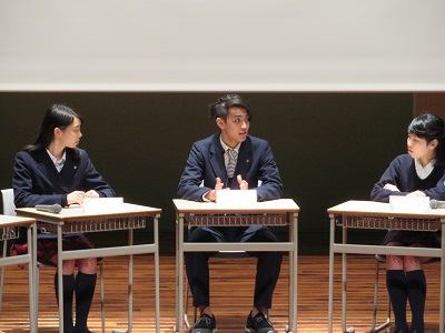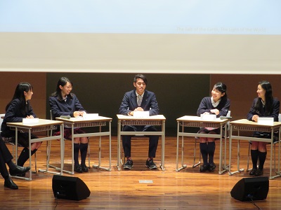 パネルトークセッションでは5名の生徒による英語でのパネルトークを行い、本校のSGH課題研究テーマである「サーバントマインド」や「多様性」「グローバル化」等をトークテーマの中心としながら、生徒が各々感じている事を自由に発言しました。