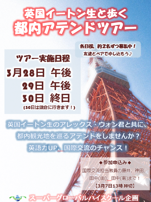 2017年3月28~30日、【英国イートン生と歩く、都内アテンドツアー】を実施します。